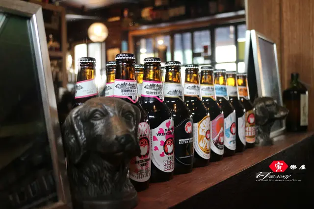 老闆,你們這隻狗狗會瞪人~XDDD , 後面整排都是常陸野貓頭鷹啤酒。
