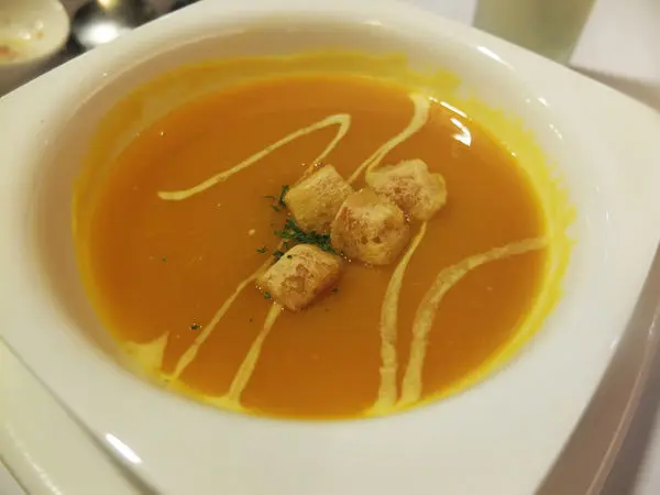 又香又酥,吃過的都滿意!旁邊還附了一小碟橄欖油+紅醋的沾醬~南瓜湯