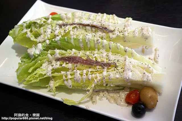 大把的羅蔓生菜青脆可口,澆上西班牙進口醃漬鯷魚製成的凱撒醬,帶點鹹鮮。帕達諾起司撒在上面增加了奶香,配一些盤邊的鹹橄欖,超對味也開胃。