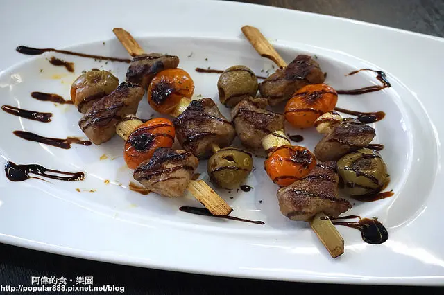 先煎過再放進烤箱烤過的豬里肌肉,不但表皮焦香,裡面還保有軟嫩又甜的肉汁,配著竹籤上烤過的番茄或橄欖吃,更突顯其風味。