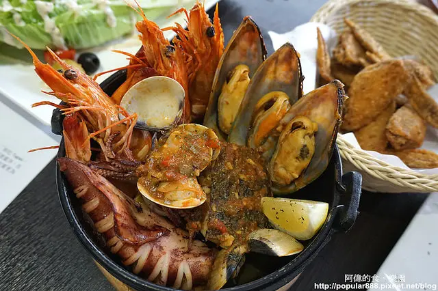 這鍋裡的料很豐富,大草蝦、鱸魚、淡菜、透抽、牡蠣等。