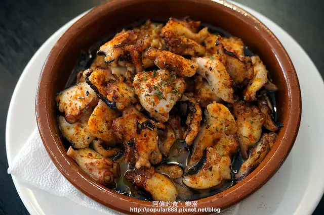 這道是同桌幾位友人都喜愛的料理,這些章魚都泡在初榨冷壓的橄欖油裡面,這還是我第一次吃到這樣的料理方式,真的很好吃!它事先用蒜碎炒過,再用鹽與胡椒調味,所以吃起來的口味是有層次的!