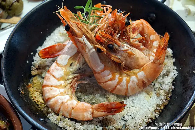 四尾新鮮大草蝦放在鋪滿粗鹽的鐵鍋上,以250度進烤箱烤熟。但這還沒結束,上桌後有下面這樣的桌邊秀....