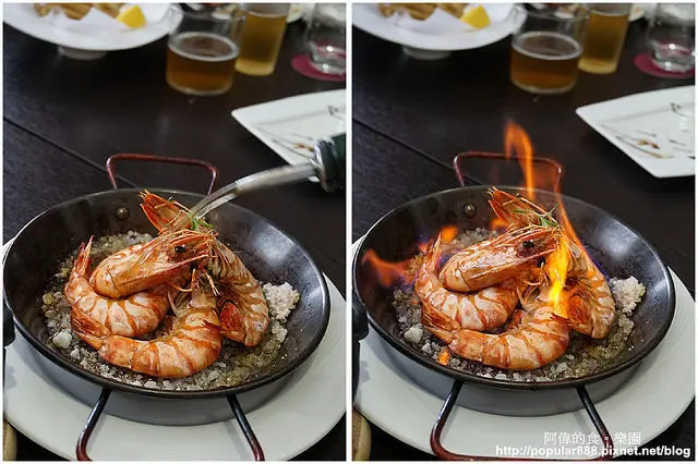 (右圖)再點火燃燒酒精,空氣中瀰漫著酒香與鹽的鹹香。蝦的外殼雖然有些部份燒焦了,但無損它肉質的美味。