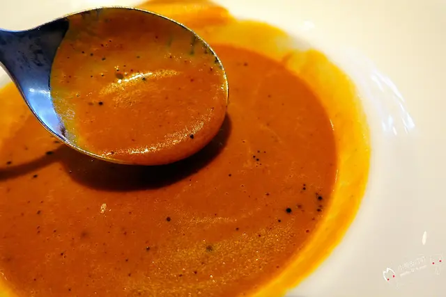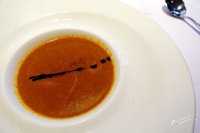 上方是羅勒油,攪拌之後該說它是湯還是醬汁。因為真的很濃郁