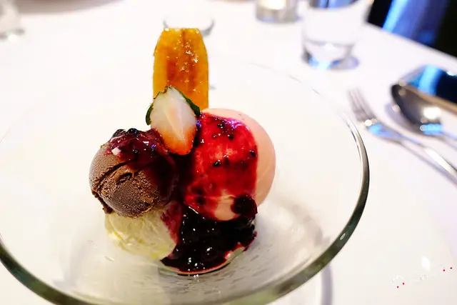 草莓、巧克力、香草三球冰淇淋,上方還淋上了莓果醬