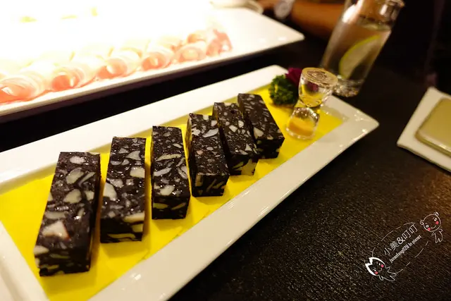 使用墨魚與雞軟骨混入墨魚於漿製作成類似牛軋糖的料理