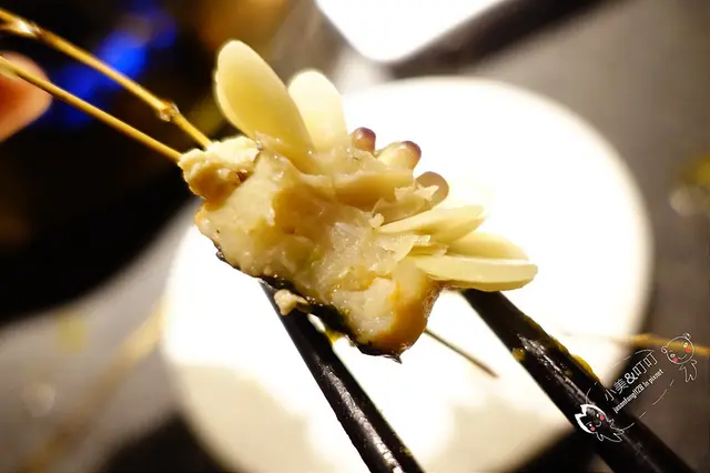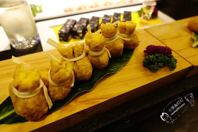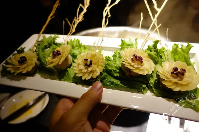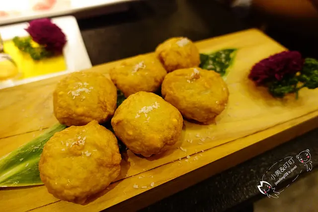 都要跟花一樣美的捨不得下鍋吃就是了,上方用杏仁片點綴還有紫玉米襯托口感也是一種視覺上的饗宴,再用茄子包覆著蝦漿而底下是海苔片