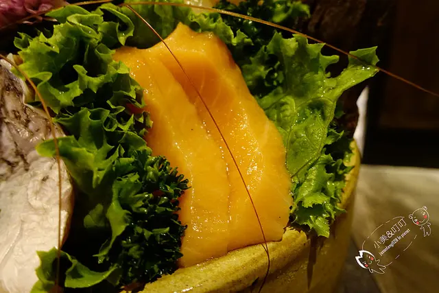 四隻肥美的蝦子、鮭魚肉、鯛魚肉、花枝、鮑魚、大顆肥嫩的干貝