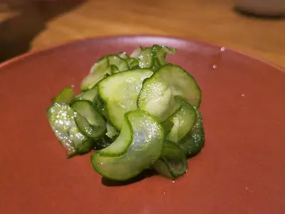 堂食的話會有10%服務費,當中除了放在檯面的熱茶外,會還附上一碟漬物,漬青瓜切得十分薄身,用柚子醋汁醃過,爽口又開胃,感覺非常清新討喜,喜歡的話可以再添。