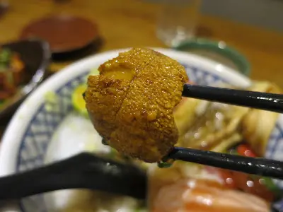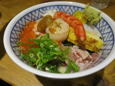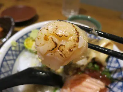 一大碗滿滿的刺身飯看得我口水直流,天使蝦、海膽、帶子、左口魚群邊、三文魚腩、海鰻、魷魚、油甘魚、松葉蟹碎、燒玉子等,雖然每樣的份量不多,但實在太合心多的人的心意,渾圓的珍珠米已先調味,絕大部份的材料都很新鮮,魚肉油份足又鮮甜,每吃一口都是驚喜、每吃一口都是感動,吃罷真的感到超滿足!