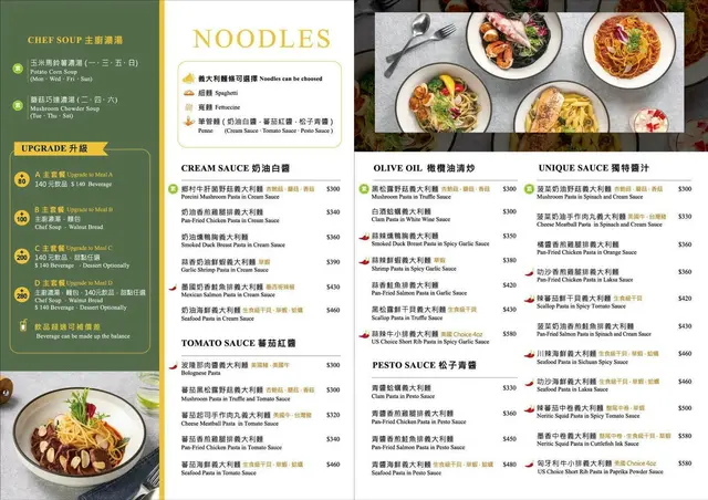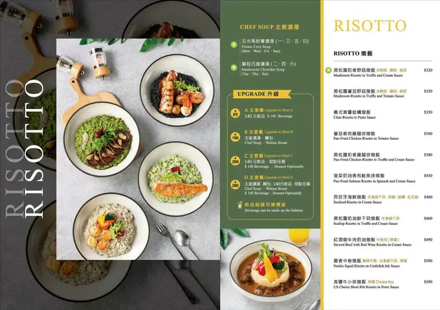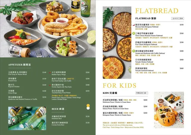 入內用餐每人是低消150元,用餐時間2小時,一看菜單真的會有選擇障礙,菜單的品項真的很多,光義大利麵就分了五種醬汁,每一種至少有六種以上的口味可以選,還有全天候的早午餐、燉飯、薄餅、開胃菜,每一道的份量都蠻大的,人多的話可以多點一點一起share,完全是聚餐首選餐廳