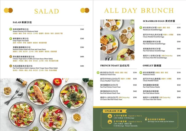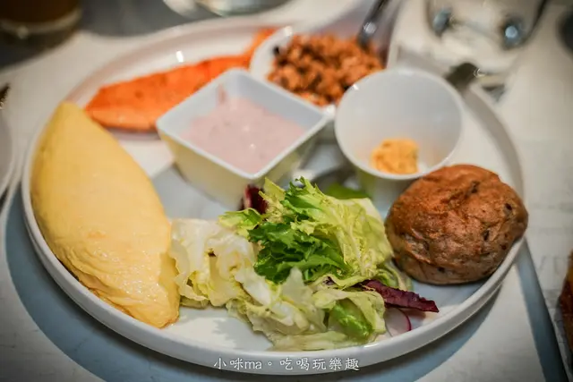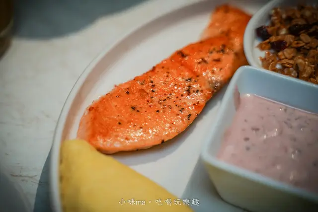 早午餐裡的鮭魚煎得很好吃,也不會太油膩,歐姆蛋Q彈牽絲,再搭配一旁的沙拉、優格、麵包,清爽無負擔,很適合女孩子