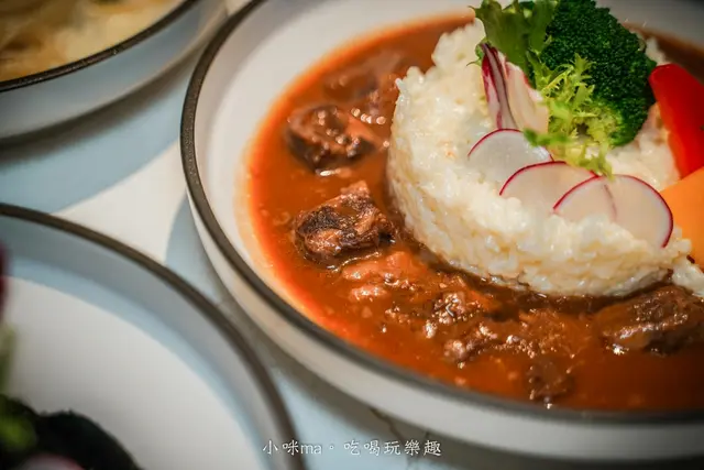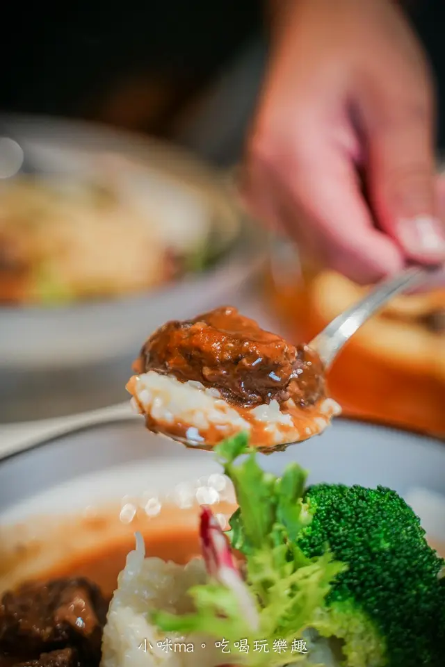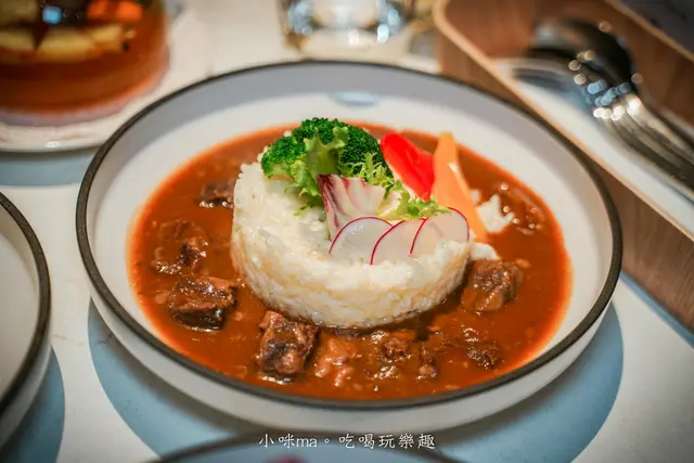 中間的是奶油燉飯,一旁淋上紅酒燉牛肉,看起來普普通通,結果一口就讓我翻轉對他的印象,哈哈,奶油燉飯帶著順口奶香,米粒不會過硬,重點是他的紅酒燉牛肉也太入味,牛肉軟嫩,醬汁鹹香到位,一口燉飯配上一塊牛肉,歐謀~他是我今天最愛的餐點
