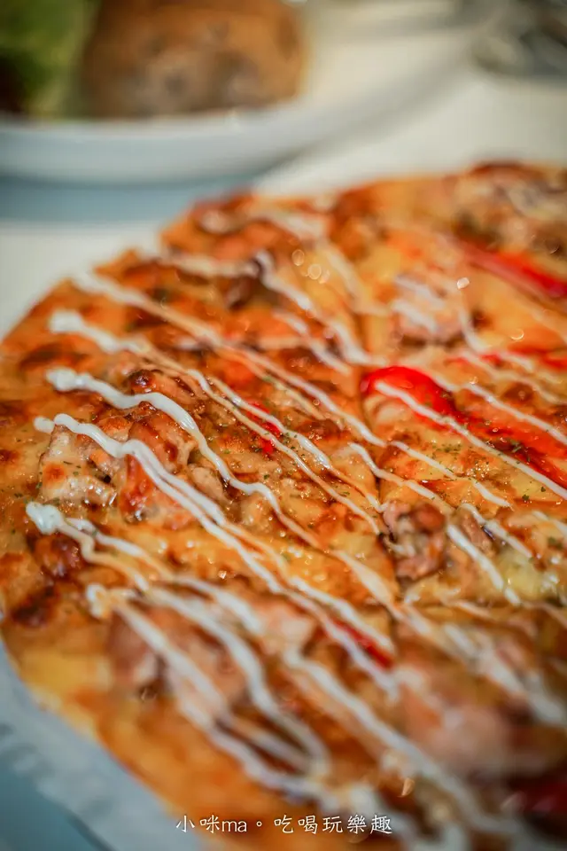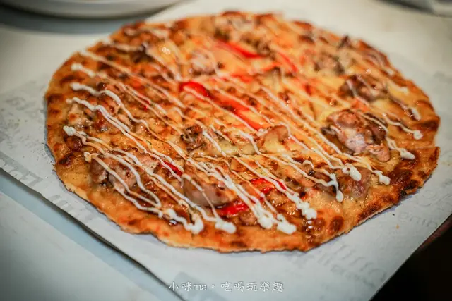 大推他們家的薄片,上頭滿滿配料還切成一塊塊的,一上桌我以為是比薩,吃起來確實有點像薄脆餅皮的比薩,但又稍微厚實一點點,日式照燒雞口味可以吃到一塊塊的嫩雞腿肉,甜甜的照燒醬再淋上美乃滋點綴,這也太涮嘴了吧~吃到最後都不會覺得太過甜膩,這樣一份四個人分著吃還OK