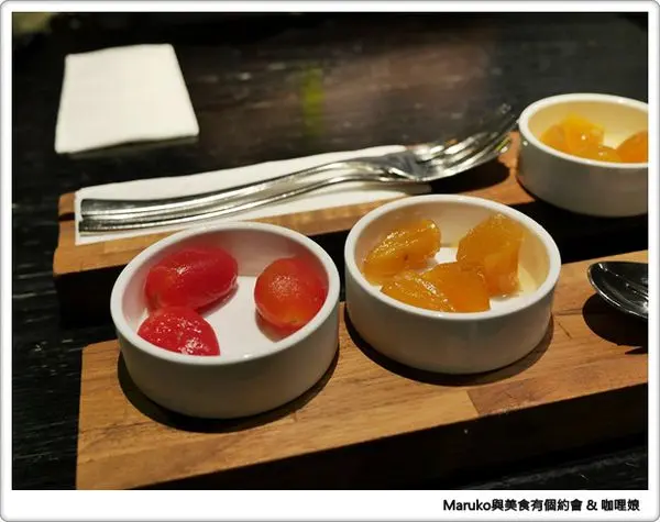 兩種冷前菜是隨餐點附上,去皮的番茄有一點忘記它的味道了,印象中吃起來不酸味道也不會太重,還接近水果本身的味道,而我個人還蠻喜歡蜜地瓜的,有家鄉的味道,蜜地瓜外層比較乾一些,比較像是被糖霜給蜜到烘乾番薯吃起來有一點硬度,又不會太甜還保留了蕃薯本身的香味。