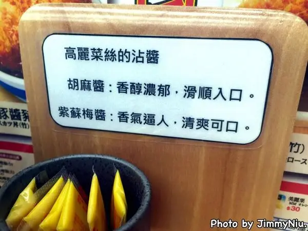 餐桌旁擺了豬排沾醬、高麗菜絲沾醬及七味粉。