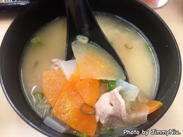 味噌湯裡有紅蘿蘿、白蘿蔔、蒟蒻片、瘦肉,滿滿的料很營養的感覺,