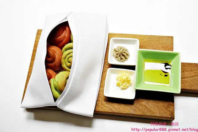 從餐前麵包開始就有”花”的意象,兩款麵包紅色的是紅麴作的,綠色的是抹茶口味。