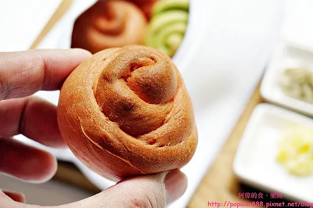 將麵包捲成像玫瑰花的造型,紅麴像朵紅玫瑰,吃起來的紅麴味不明顯,據說蠻養生的。