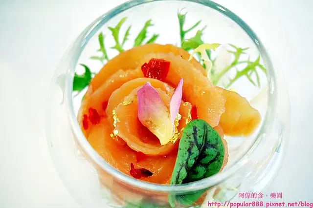 取諧音”鮭”同”瑰”,而且是將燻鮭魚捲成像朵玫瑰花放在玻璃杯中,再裝飾些食用花瓣及金箔,既夢幻又美味。