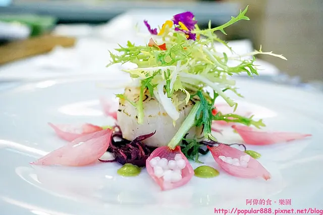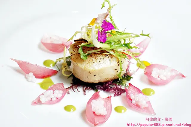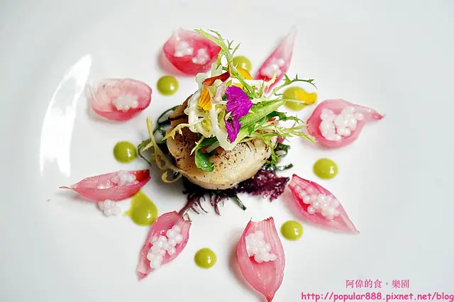 綠色的醬汁是用台灣的香菜跟義大利的巴西利依比例用果汁機打成的;至於粉紅色”花辦”則是用迷你小洋蔥與甜菜醬汁及一些糖濃縮出來的。