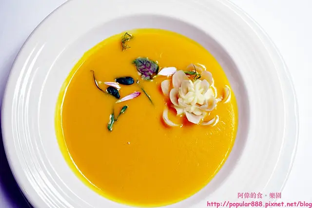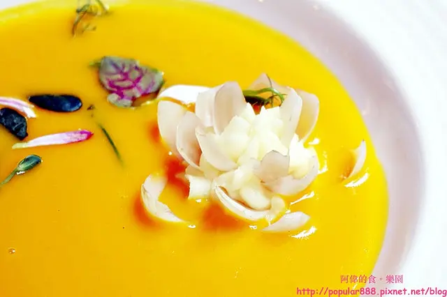 這根本是一幅畫吧?我沒見過這麼美的南瓜濃湯,師傅在一側放上食用花及芽菜組合成的”出水芙蓉”,很有意境。