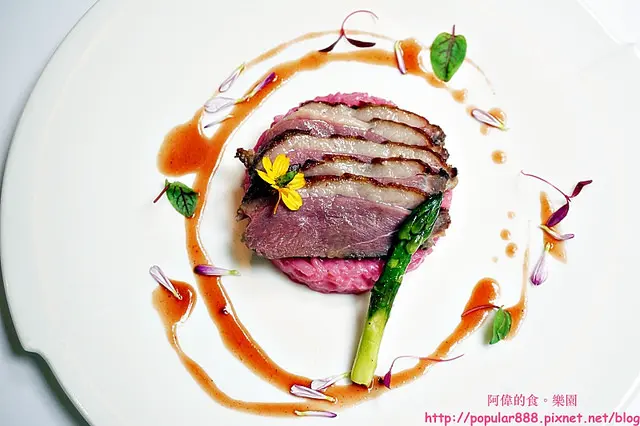 可以看到鴨胸的油脂相當飽滿,底下墊的粉紅色燉飯也讓人眼睛一亮。