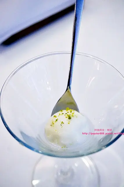 在吃主餐之前,先送上一小球的檸檬雪酪,讓冰涼清爽的雪酪能清理一下口中的味覺,不過阿偉覺得有點過酸,怕酸的人要小心吃。