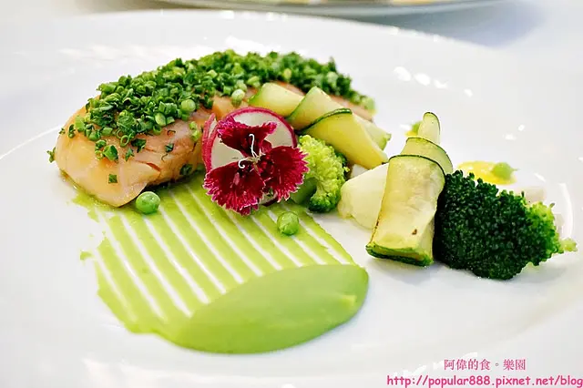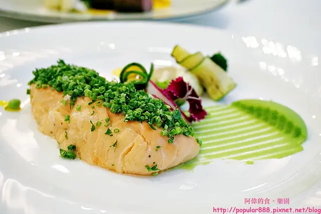 這是友人選的主餐,鮭魚用低溫48度烹調,上面撒了巴西里碎以及蝦夷蔥碎,呈現有如草原意象。