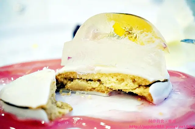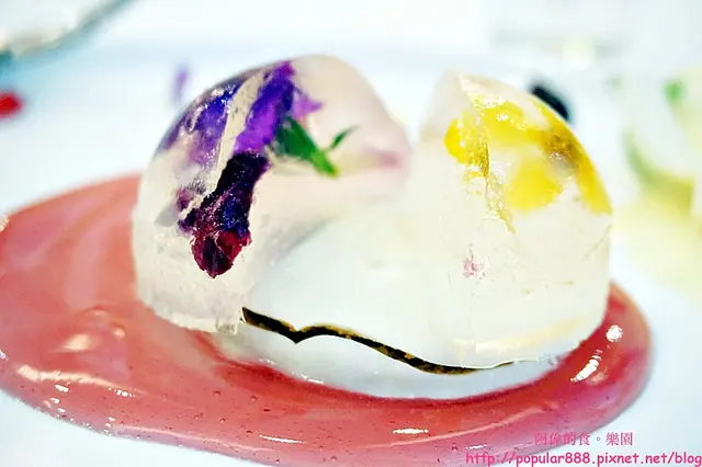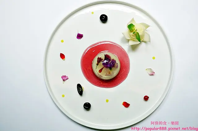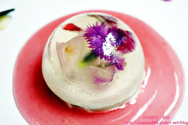 中間的主角是水晶果凍,底部有餅乾為基座,盤上紅色的是玫瑰荔枝醬,整體非常漂亮也好吃。