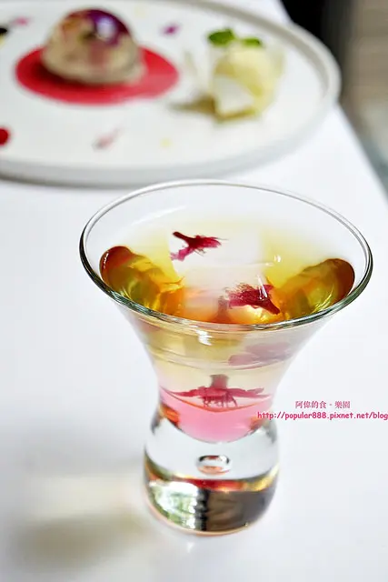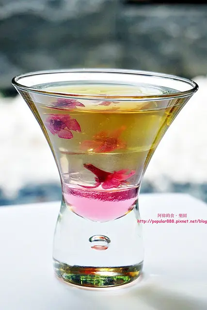 其實每一朵都用果凍給凍住,所以花瓣都能以綻放的姿態漂在水中,而立方體的果凍在水中有很像冰塊,這杯如夢似幻的飲品喝得到茶味與玫瑰清香,視覺也是一大享受。