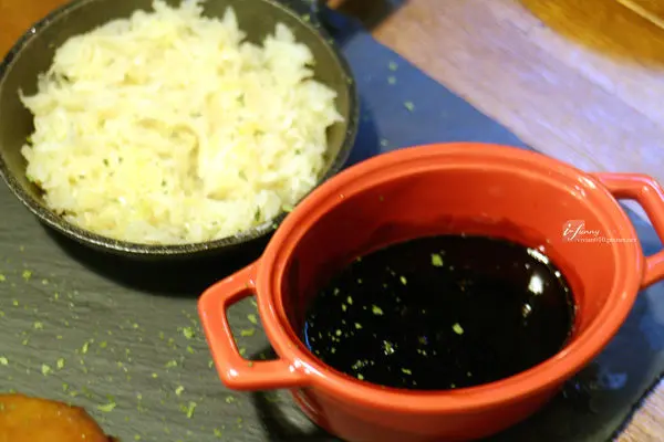 除了德國豬腳的老搭檔-黃芥末及酸菜之外,還提供了水果油醋醬。