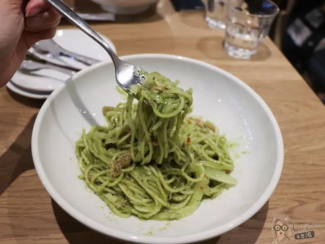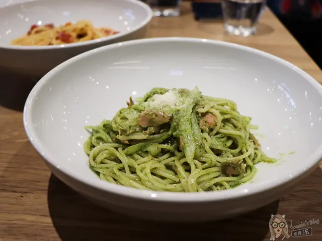 鮪魚青醬的口味較為清爽,青醬的味道比較淡一些,沒有期待中的濃郁。一般的乾燥義大利麵,煮起來會較硬沒有彈性,容易斷裂,生麵條煮起來則有著Q中帶軟黏的口感,口感確不太一樣。配料炒上一點洋蔥增加甜味,橄欖油與青醬的黏稠度較高,總是擺脫不了有點越吃越乾的缺點。這道我個人覺得普通,口味上是協調但沒感覺特別出色。