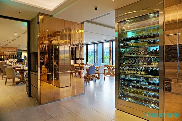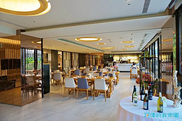 進入餐廳迎面而來的是大片落地窗所帶進來的光線,加上金色鏡面牆,讓空間明亮有朝氣。