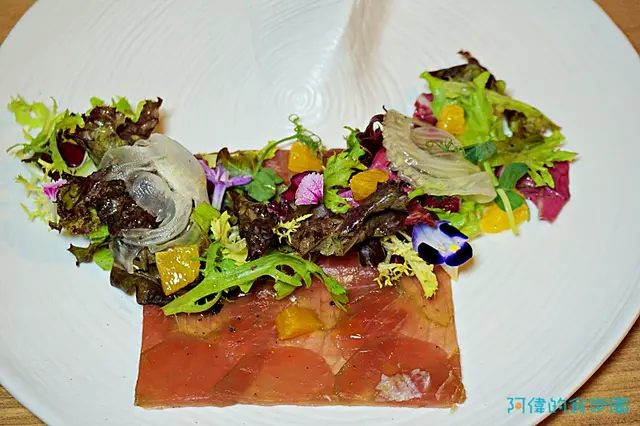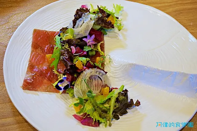 將醃製過的鮪魚薄片佐以柑橘醬汁,搭配新鮮生菜,魚肉鮮甜與水果風味的蜜甜融合其中。