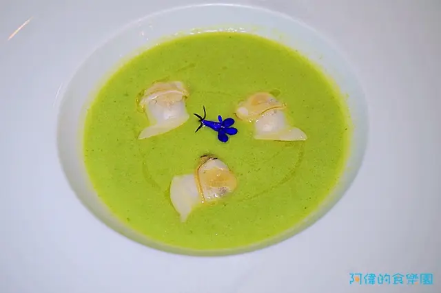 三顆飽滿的蛤蜊肉在青綠色的湯中,點綴了一朵藍色食用花,即具簡約美感。