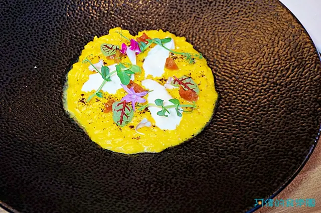 以阿里山山葵為主要調味,並特別選用吸水力強,口感絕佳的義大利Acquerello陳年長米,以馬斯卡彭起司取代一般燉飯常使用的帕瑪森起司、橄欖油取代奶油,更加了煎烤鮭魚碎與鰹魚凍,讓口感更具層次,堆疊而上,嗆香氣直衝鼻樑。