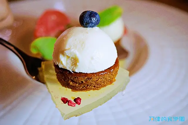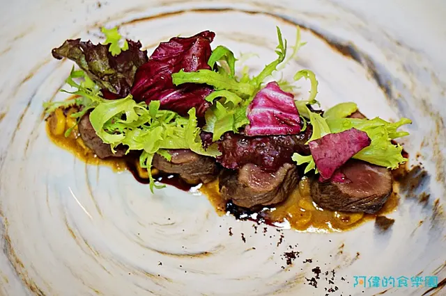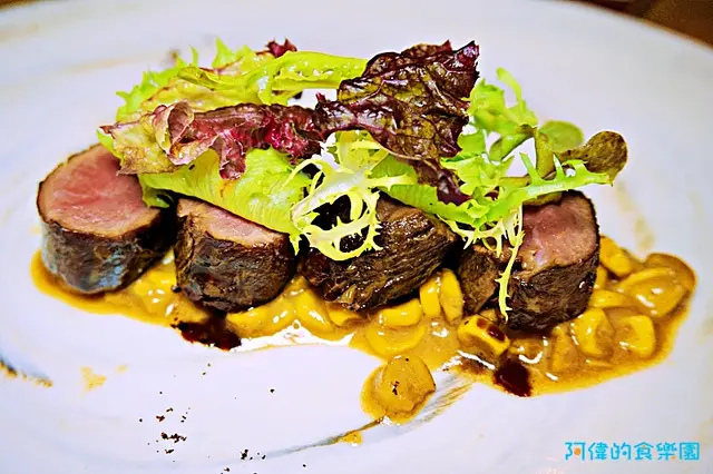 上桌時就如ㄧ幅畫作,杏桃與紅酒醬汁搭上慢火煎烤的鴨胸肉,外皮焦香且肉質軟嫩,與帶點酒香的醬汁一口咬進,皮下油脂與肉汁融合,絕妙的滋味啊!