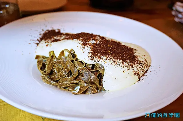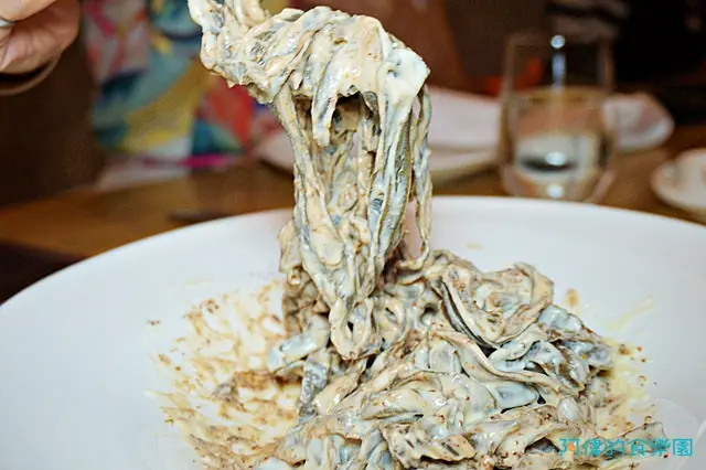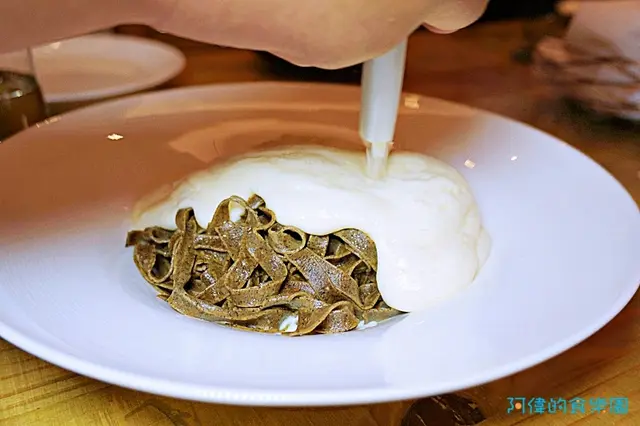 顛覆所有人對提拉米蘇為甜點的印象,以每日手工現作的咖啡義大利寬麵條,和義大利的乳酪之王帕瑪森乾酪,以氮氣瓶打泡的方式(上圖),鋪滿整個義大利麵,最後撒上咖啡粉,咖啡麵條包裹著瑪森乾酪的香氣與濃郁口感。