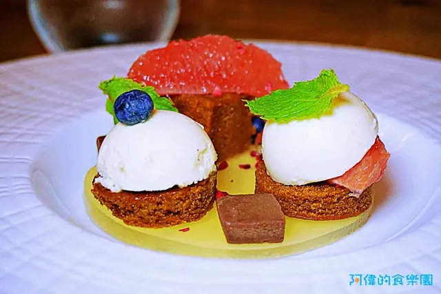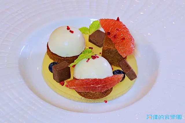白色慕斯放在巧克力蛋糕上,最底部是透明的果凍,還有幾片紅葡萄柚及巧克力,讓苦甜與酸甜融在一起。