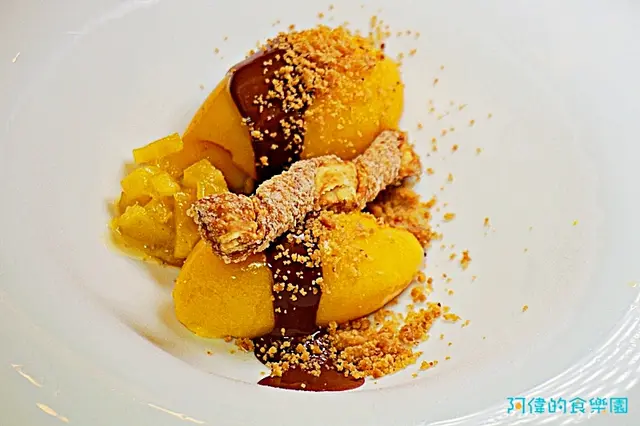 巧克力醬有如畫圖,在黃色的芒果冰淇淋上非常搶眼好看。
