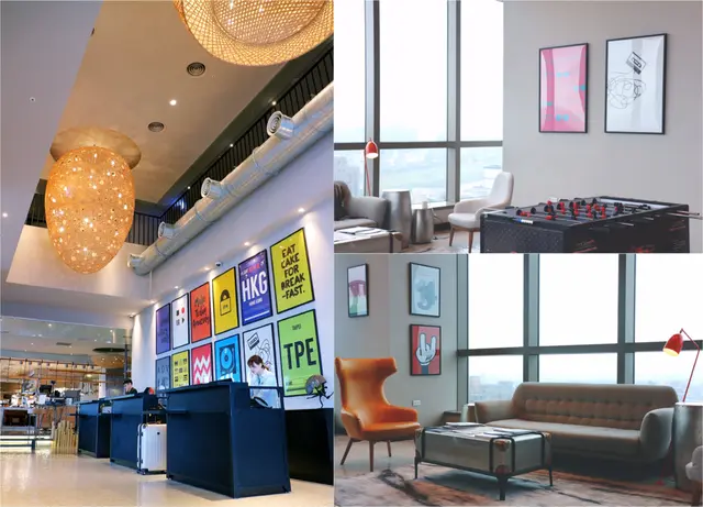 Check-in 櫃檯位於17F,打開電梯就可以看到挑高的明亮大廳,右拐是休息大廳,環繞著落地玻璃,直接眺望台北市景,清楚的101跟南山微風大樓矗立眼前。配合飯店現代簡約、帶點POP風格的裝潢,甚至還擺著桌上型足球台、還有乒乓球桌(!),充滿年輕活潑的氛圍。