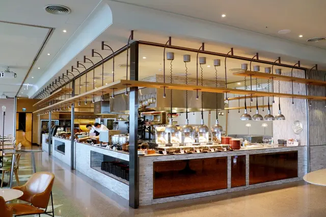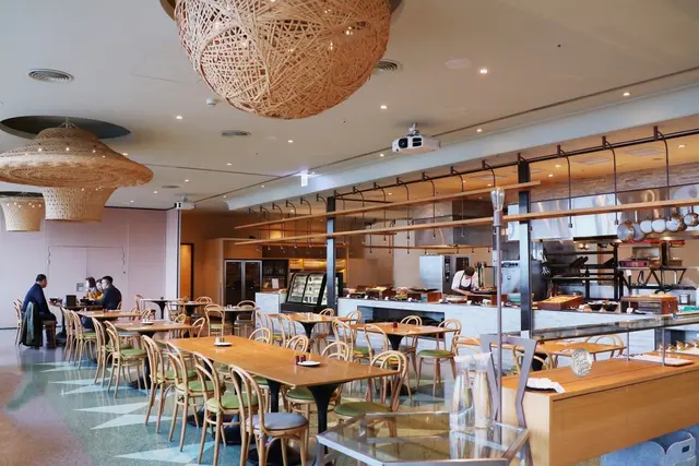 「Que」因為是以前火車站大樓,所以也把地板模擬以前舊大樓地板的質感,且用餐環境十分怡人,以中間的開放式中島廚房餐廳分為兩區塊。左邊靠外側,擁有整面的窗戶眺望市景、還能看見飛機起降(當天就看見了好幾次);右邊雖然是建築內側,但因為將空間設計為挑高的7米中庭,天花板做成透光的天窗,所以採光也非常好,開闊毫不壓迫感,因此也很常有人來這裡當作婚宴場地,或舉辦各種聚會活動。