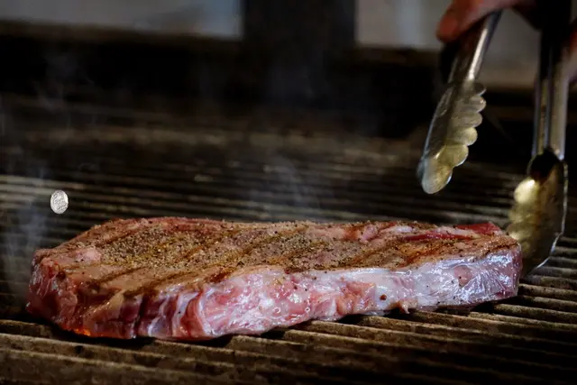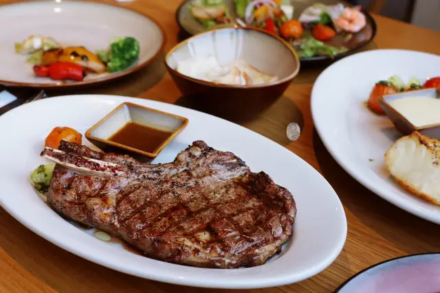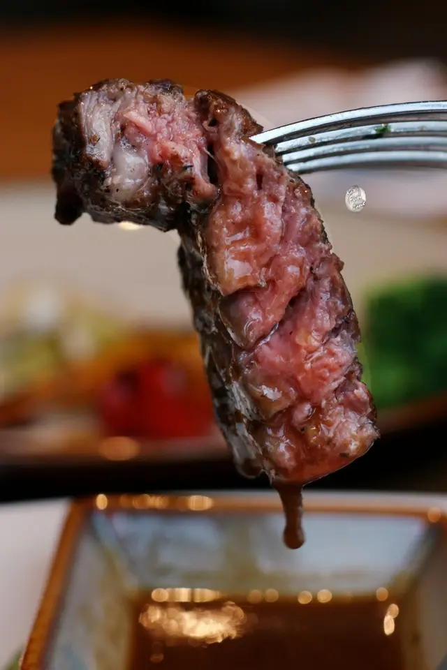 「Que」使用的牛肉來自美國Brandt家族農場,肉質經過35天的熟成。看著廚師豪邁地將厚實的肋眼放在已經炙熱的烤架上,肉接觸高溫的剎那,“滋唰!”的聲響隨著煙霧沖天而起,甚至可以清晰聞到爐火裡劈啪作響的龍眼木,燃燒傳出的燻香。煎過後,廚師再將牛排拿離鐵架靜置冷卻,讓肉汁鎖在牛排當中。
