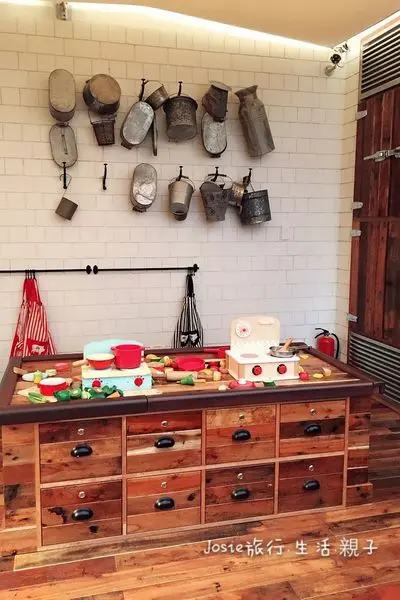 L型格局的轉角處,擺設了三桌讓小朋友玩樂的小小廚師工作檯,