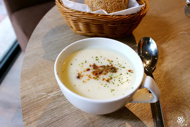 濃湯上灑了許多培根的炸屑和羅勒葉