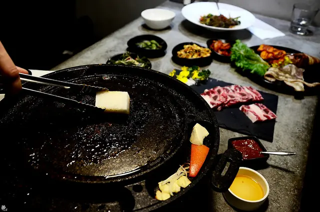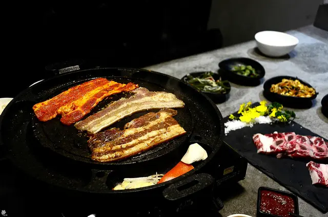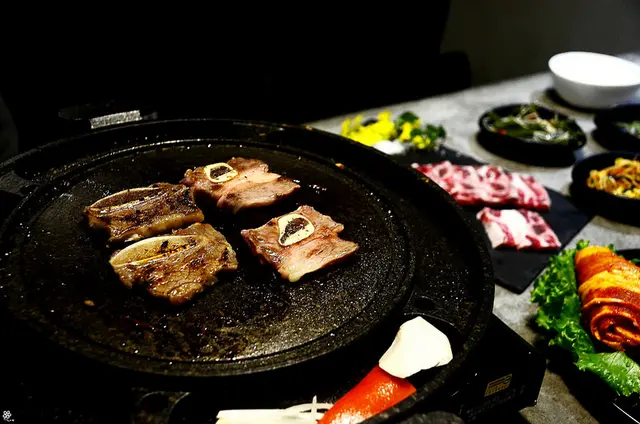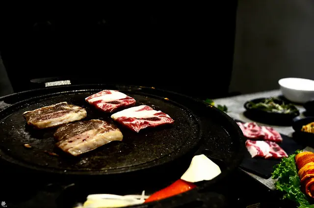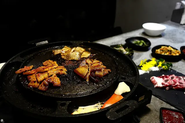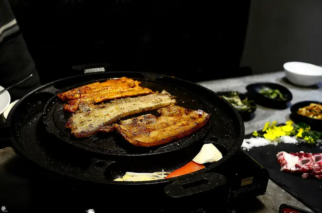 在滋滋作響的圓盤上,烤了幾秒鐘就能依照喜愛包入泡菜、蒜片等一起入口,