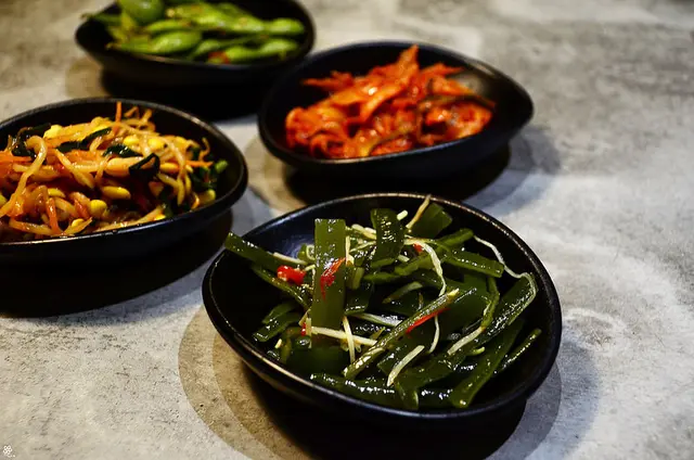 一格加熱泡菜與醃豆芽,可以包入生菜與肉一起吃,