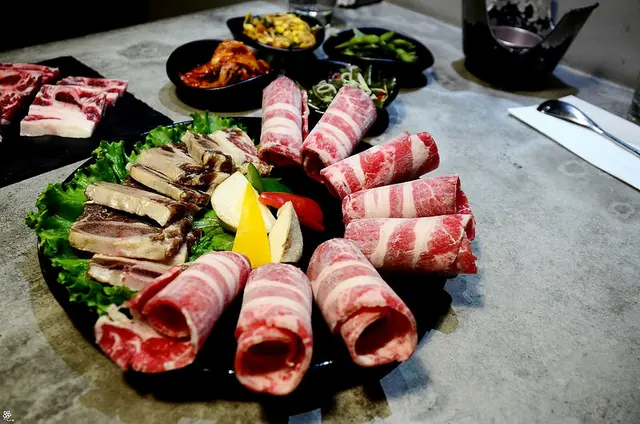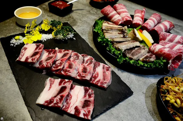 肉品亦提供了原味帶骨牛小排、醃漬帶骨牛小排、牛五花和豬五花炎彩三味燒(味噌、辣醬、椒鹽),